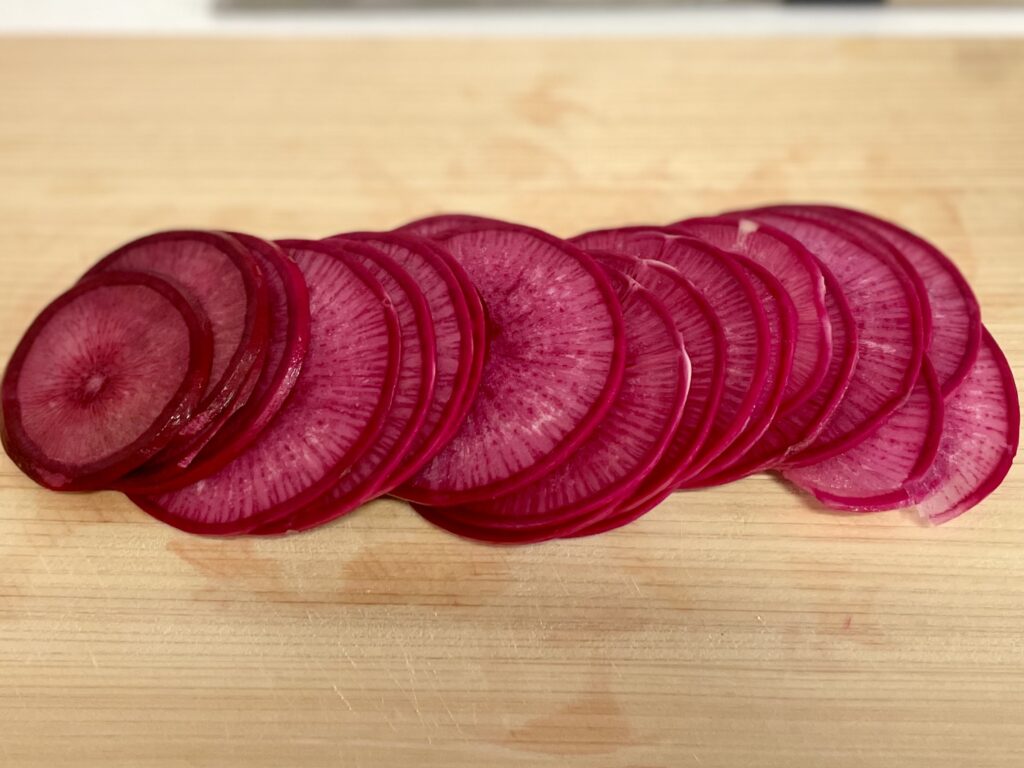 赤大根は皮ごと使い、1~2mmほどの薄切りにする。