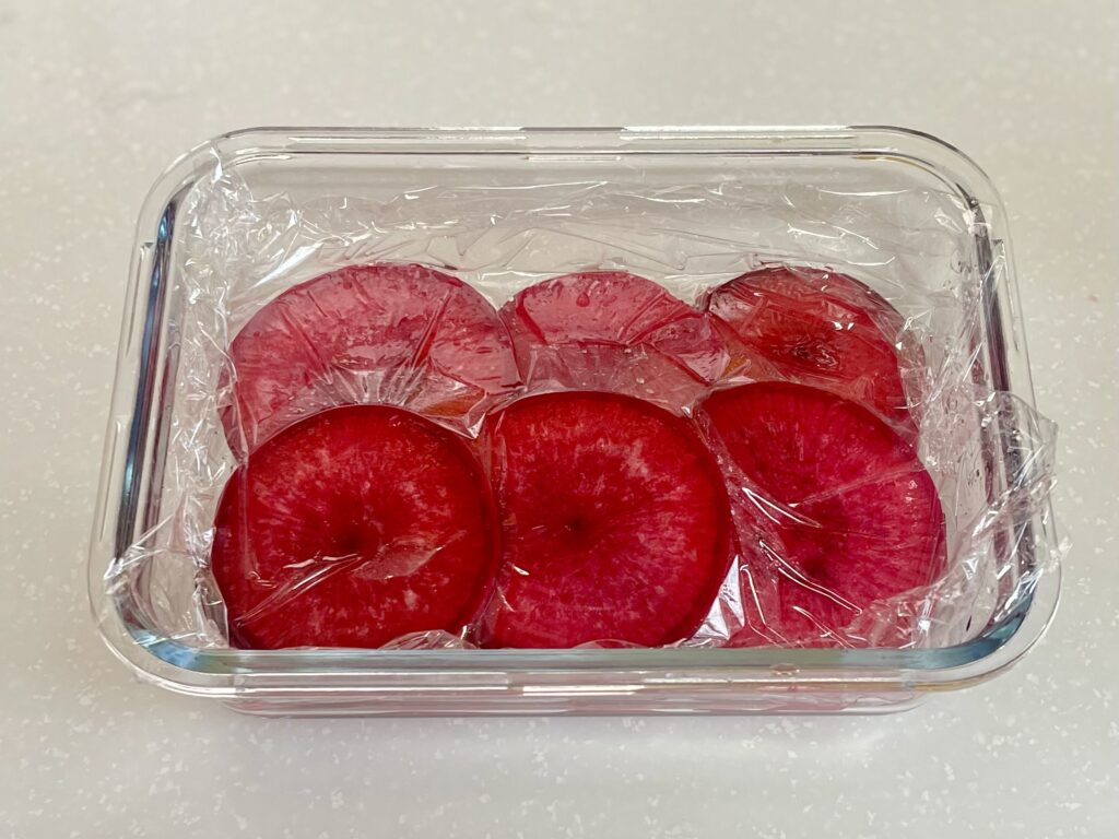 余計な材料は使わず、酢と砂糖、ほんの少しの塩だけ。シンプルだからこそ、赤大根そのものの風味が際立ち、食卓に添えれば、季節を感じるひと皿になります。