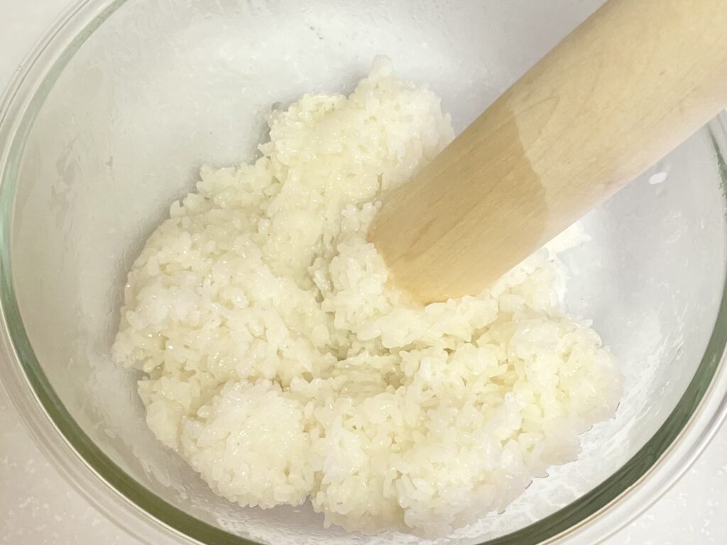 炊き上がったら、すりこぎやしゃもじで軽くつぶす(半殺し)。