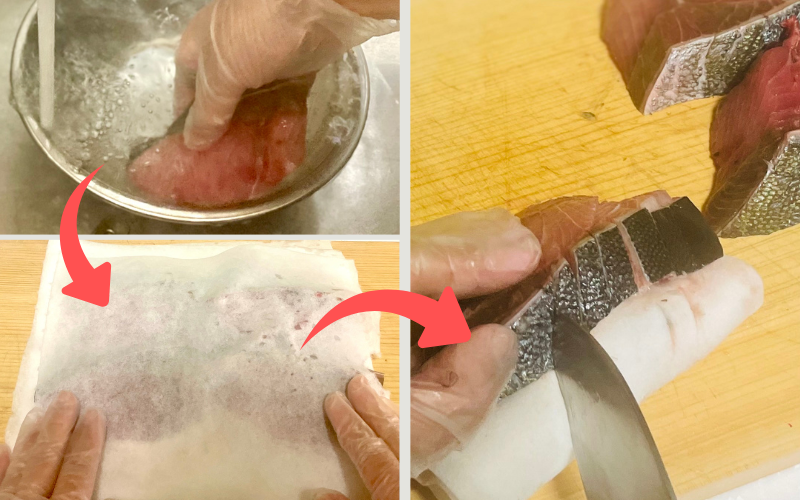 ・鰤の切り身に軽く塩をふって、15分ほどおき、出てきた水分と塩を洗い流して水分を拭き取る。皮目に0.5〜1cm間隔で浅く切り込みを入れる