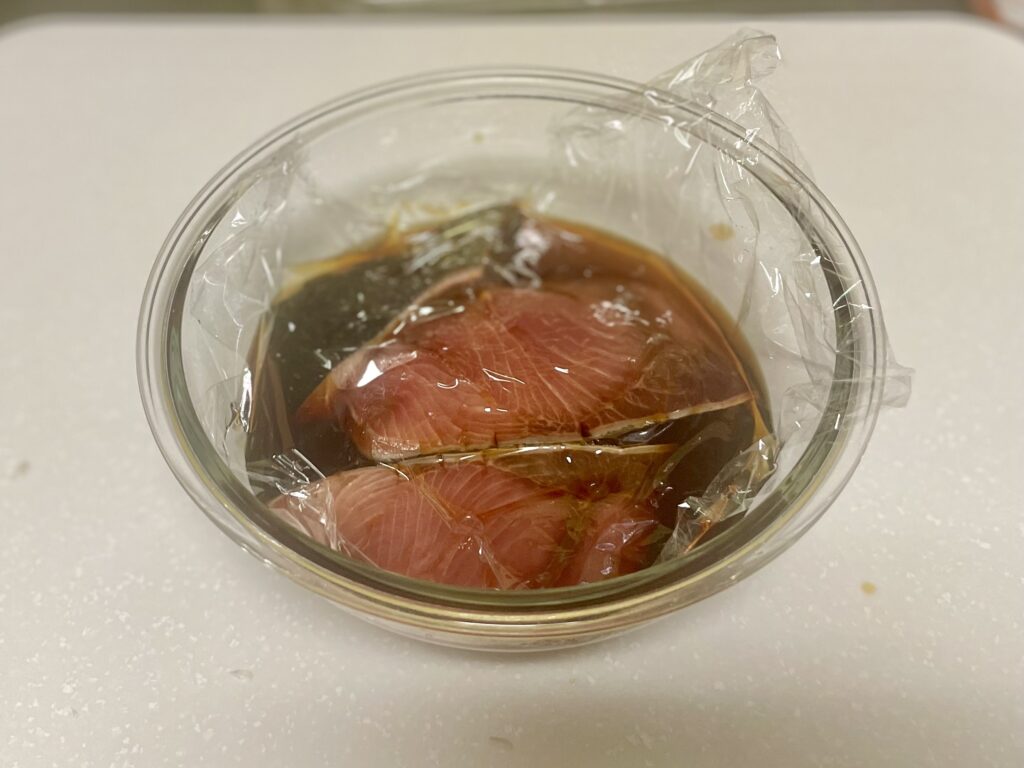 水気をふき取った鰤の切り身を加え、落としラップをして20分ほど漬け込む。