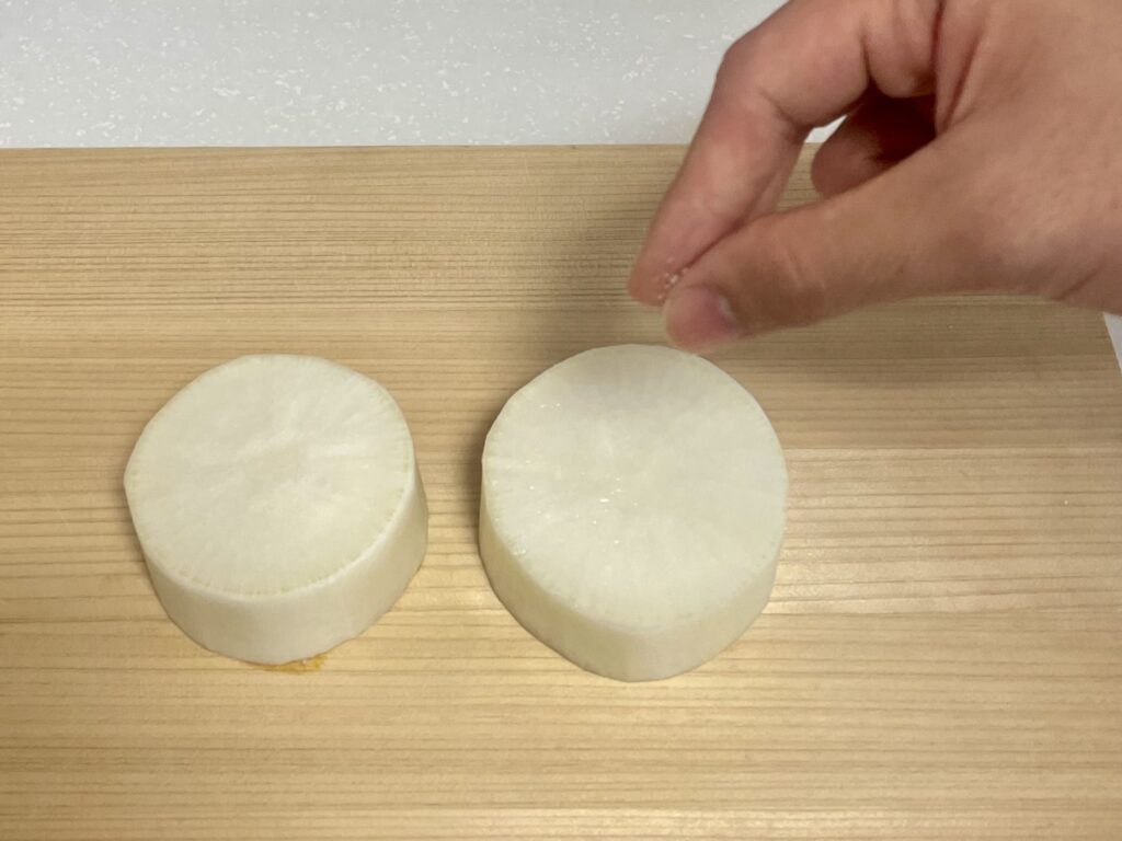 大根を厚さ2㎝の輪切りにして皮をむき、表面に軽く塩をふってなじませる。
