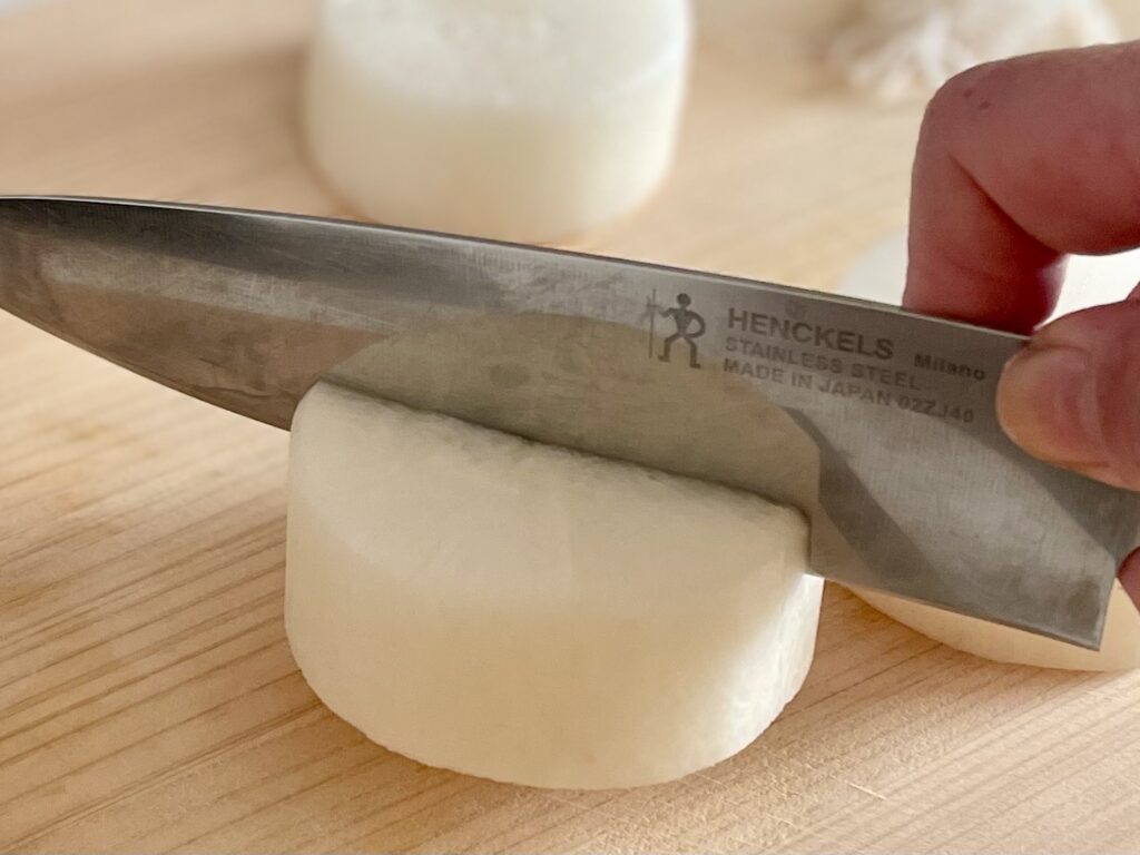 面取りをし、片面に十字の隠し包丁(大根の厚さの1/3程度)を入れる。