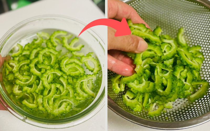 - ゴーヤーは縦半分に切ってワタと種を取り、3〜4mm幅にスライス。軽く塩もみして10分ほど置き、水で洗って絞る。