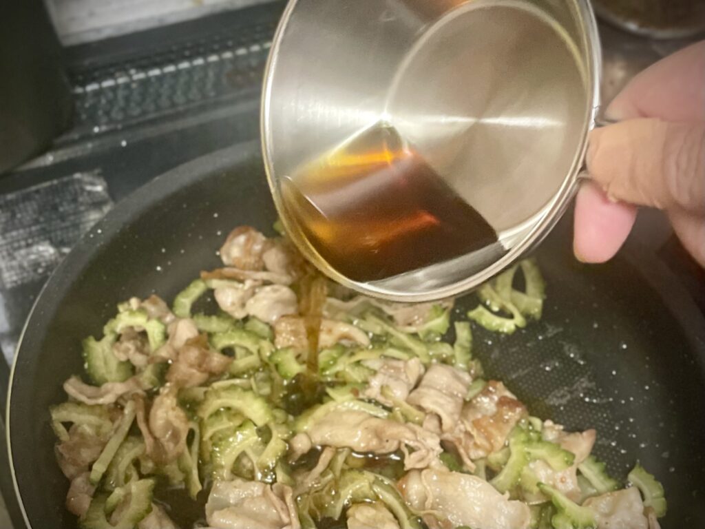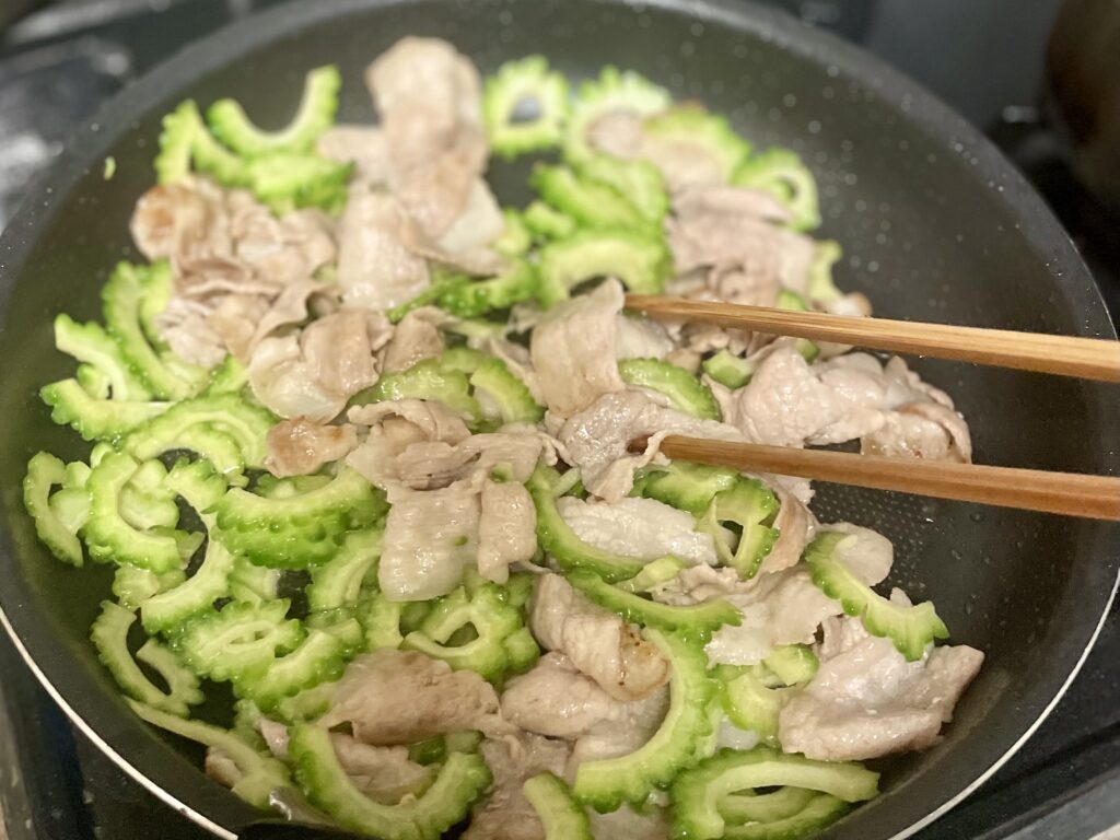 同じフライパンで豚肉を炒め、色がだいたい変わってきたらゴーヤーを加えて強火で炒め合わせる。