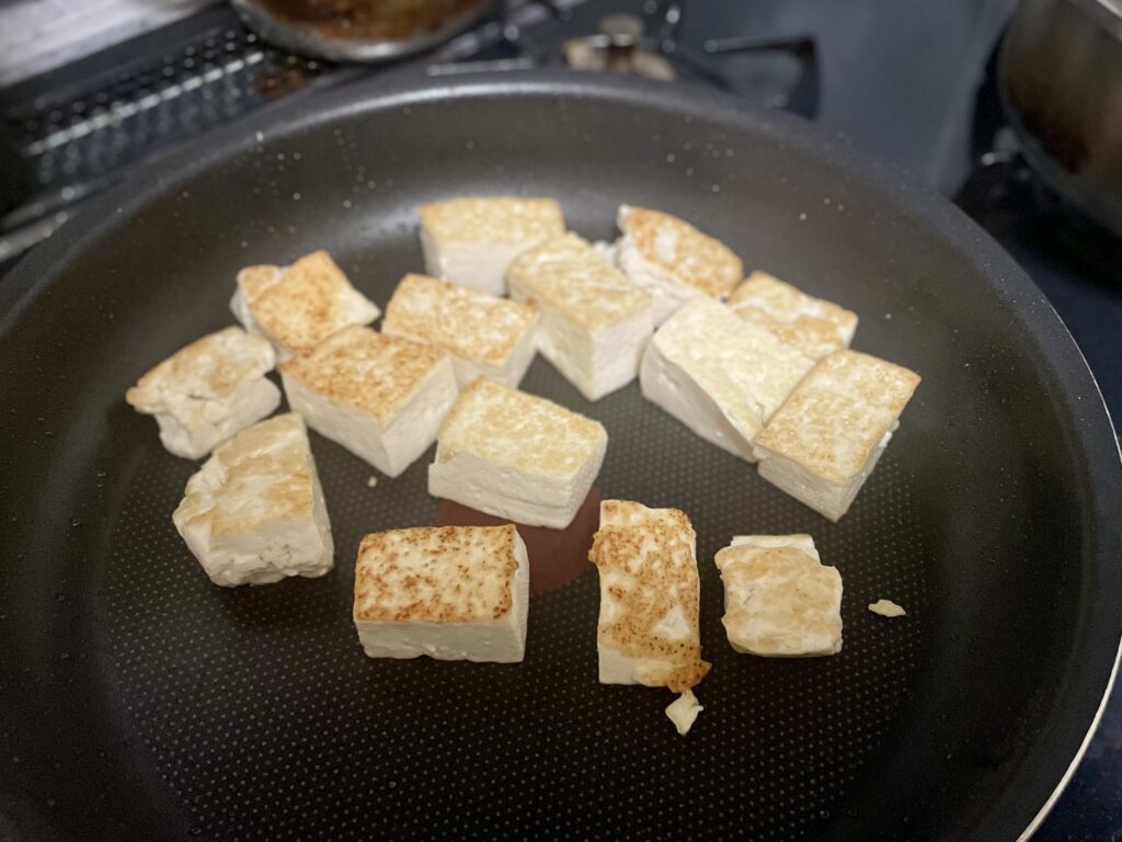 フライパンにサラダ油を熱し、豆腐を並べて中火で両面にこんがり焼き色をつける。焼けたら一旦取り出しておく。