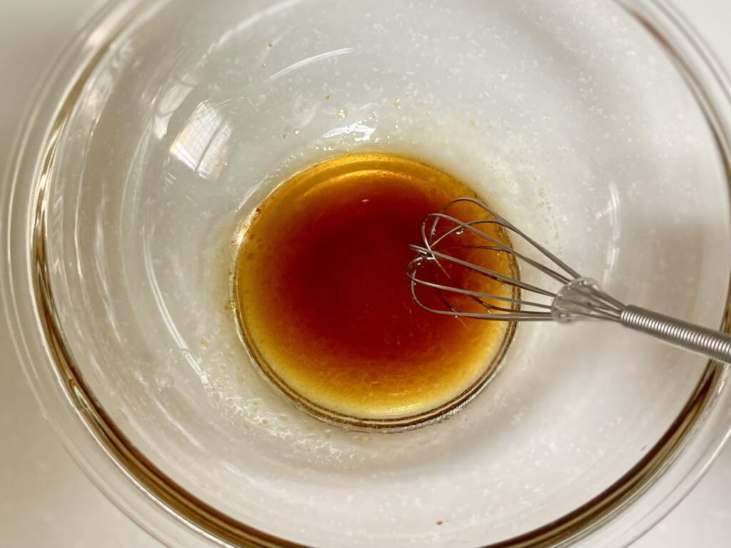 ボウルにA(酢・砂糖・醤油・ごま油・塩)を合わせ、砂糖が溶けるまでよく混ぜます。