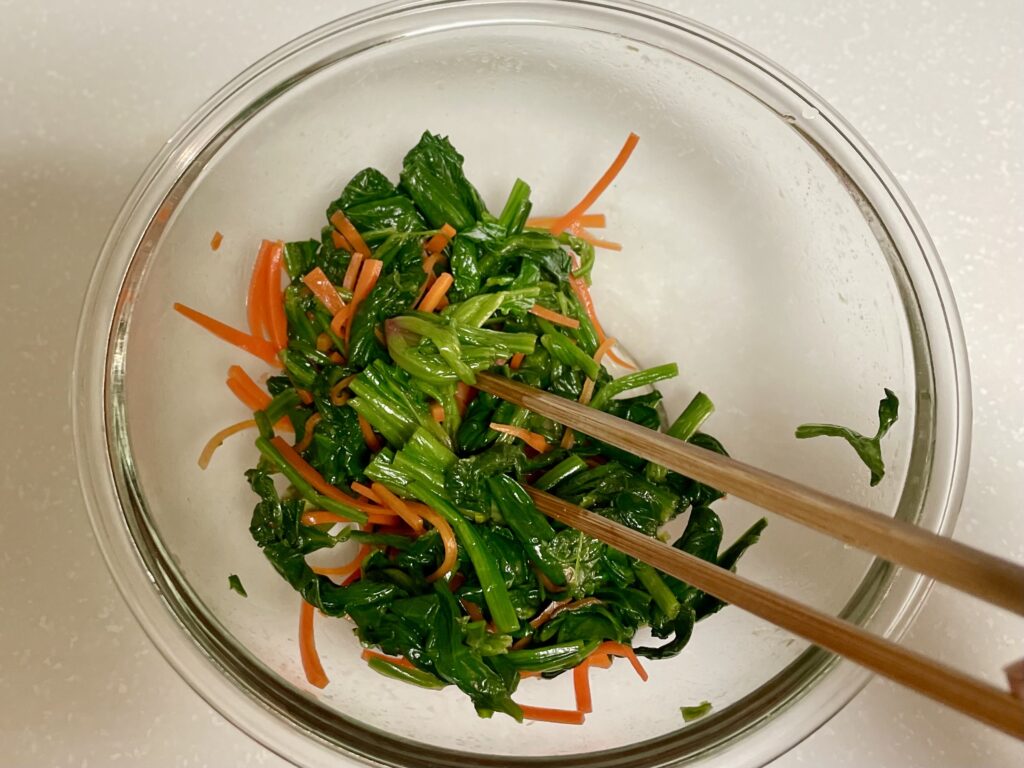 甘酢ダレにほうれん草とにんじんを加え、全体に味が行き渡るようふんわりと和えます。