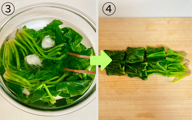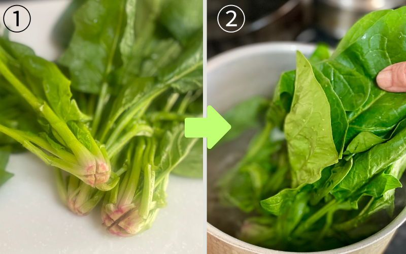 ①ほうれん草は根元をよく洗い、根を切って切込みを入れる。