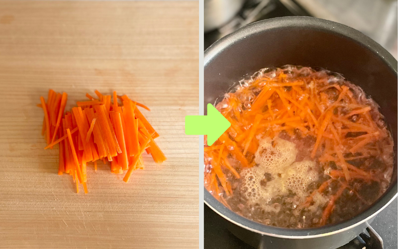 にんじんは細切りにして、熱湯で30秒ほどゆでてザルにあげます。