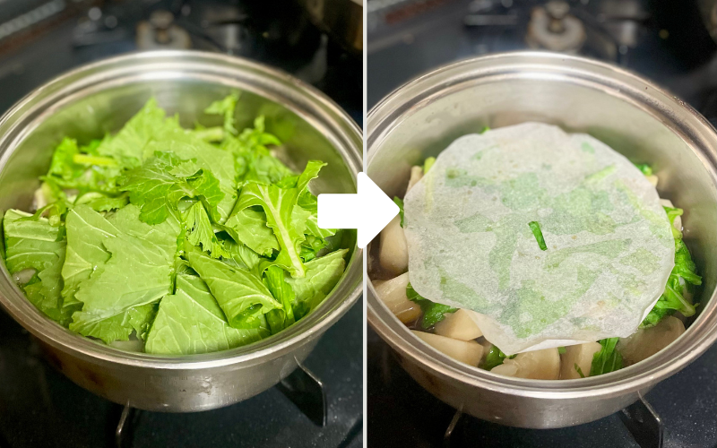 かぶの葉を加えて1〜2分煮て火を止め、そのまま少し置いて味を含ませる。
