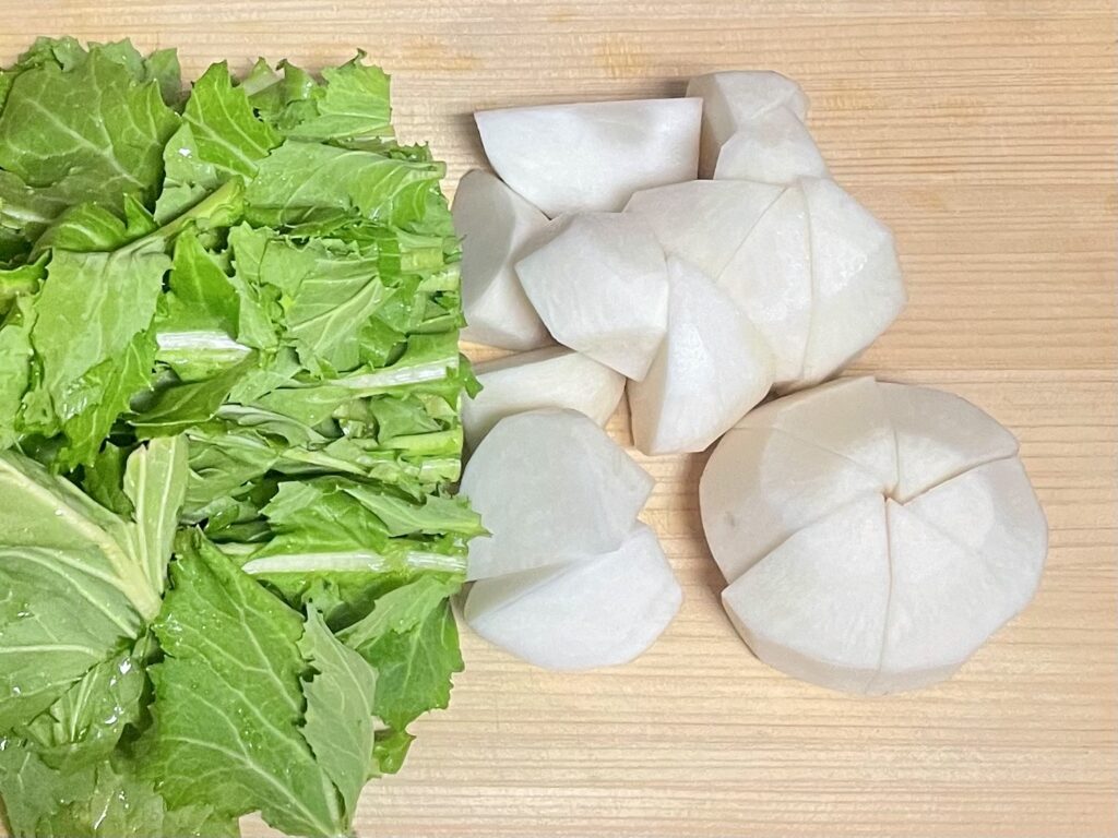 かぶは葉を切り分け、皮を薄くむいて、6等分のくし形にする。(筋が硬い場合は、少し厚めにむく)葉は4㎝程度の長さに切る。