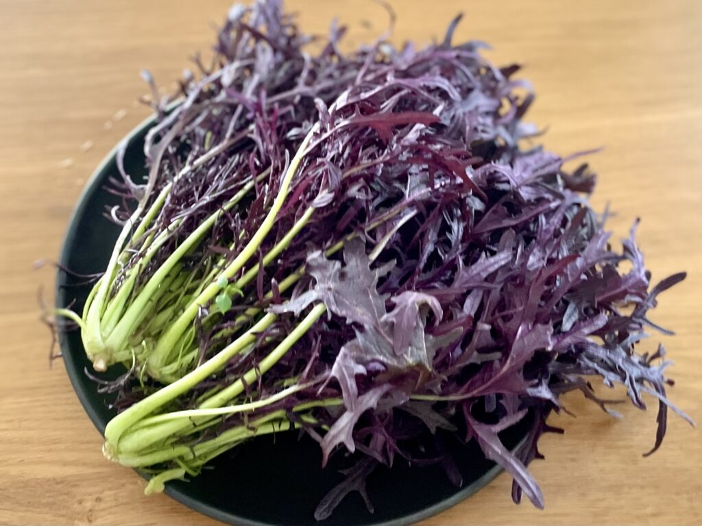 赤いからし菜は、見た目よりも辛みが穏やかで、爽やかな風味が魅力です。
