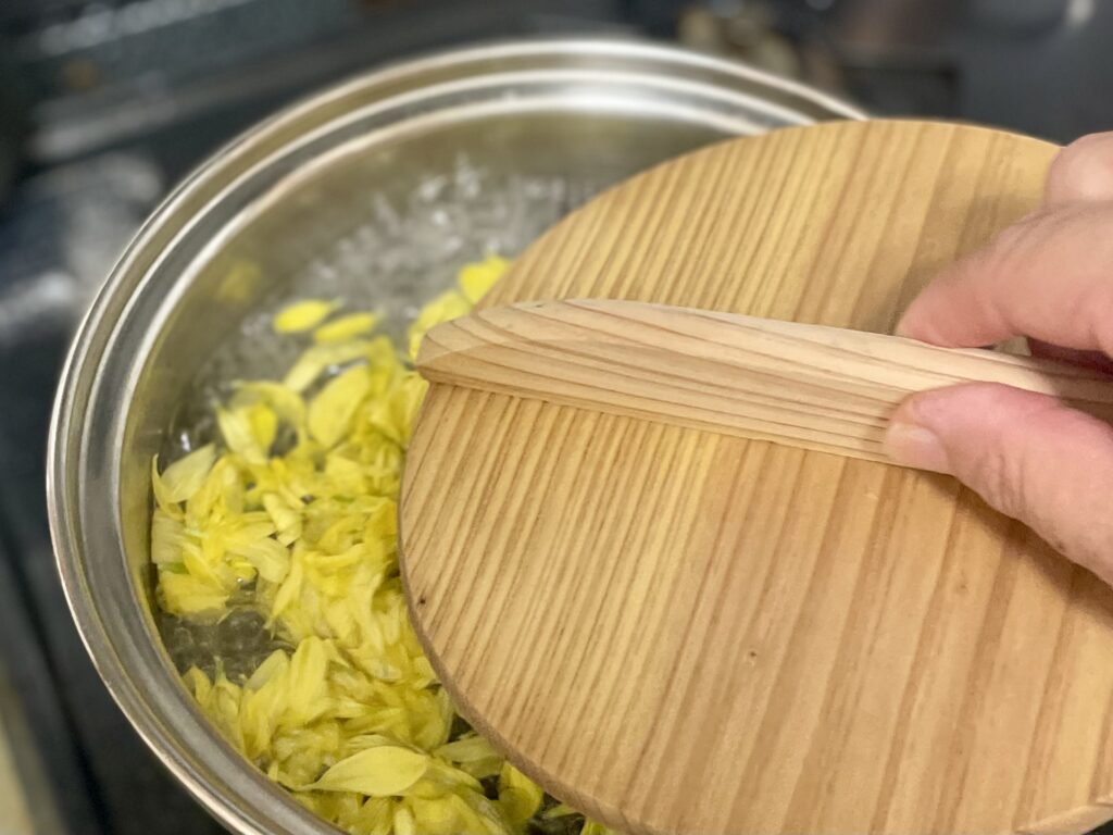 花びらを摘み取り、酢を少し加えた熱湯で10〜15秒ほどさっと茹でる。