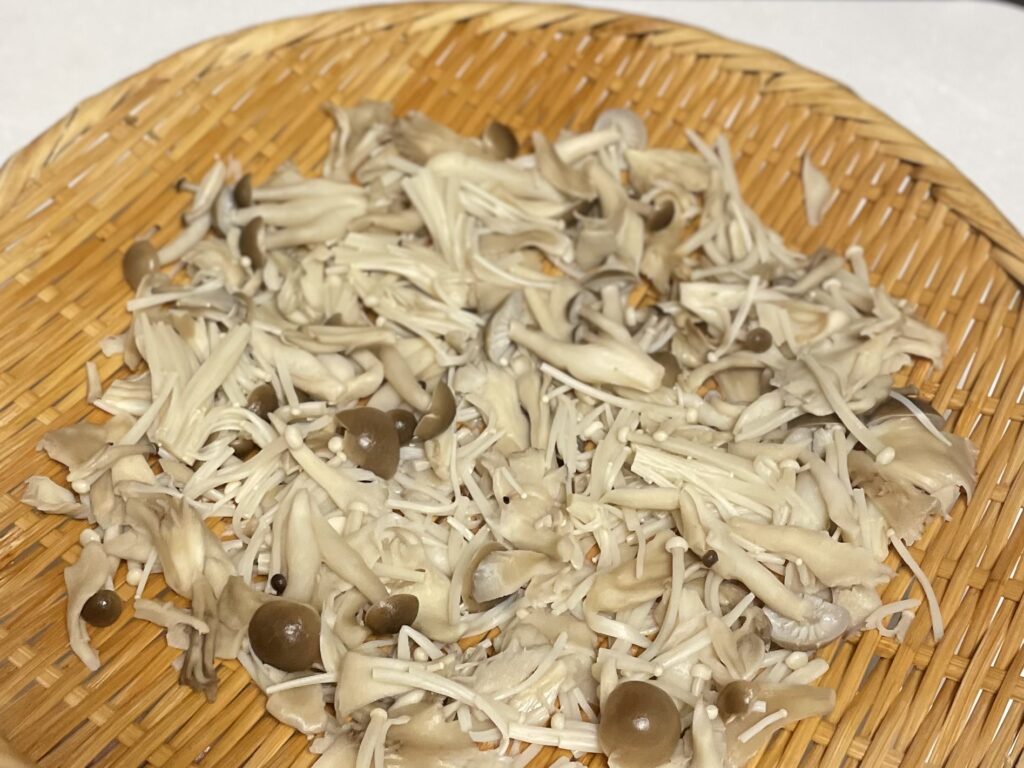 菊花はしっかり絞り、きのこは熱いうちにザルに上げて、なるべく大きく広げて冷ますのがポイントです。