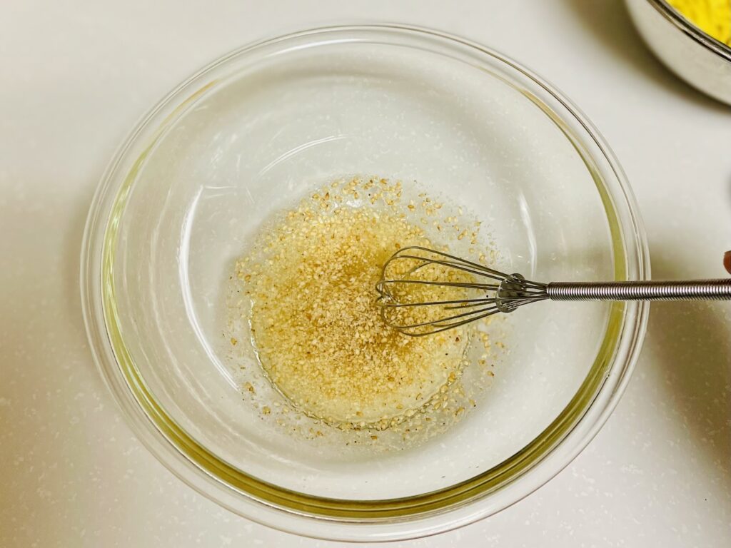 ボウルに白だし・水・酢・薄口しょうゆ・すりごま(仕上げ用に少しとっておく)を入れてよく混ぜ合わせる。
