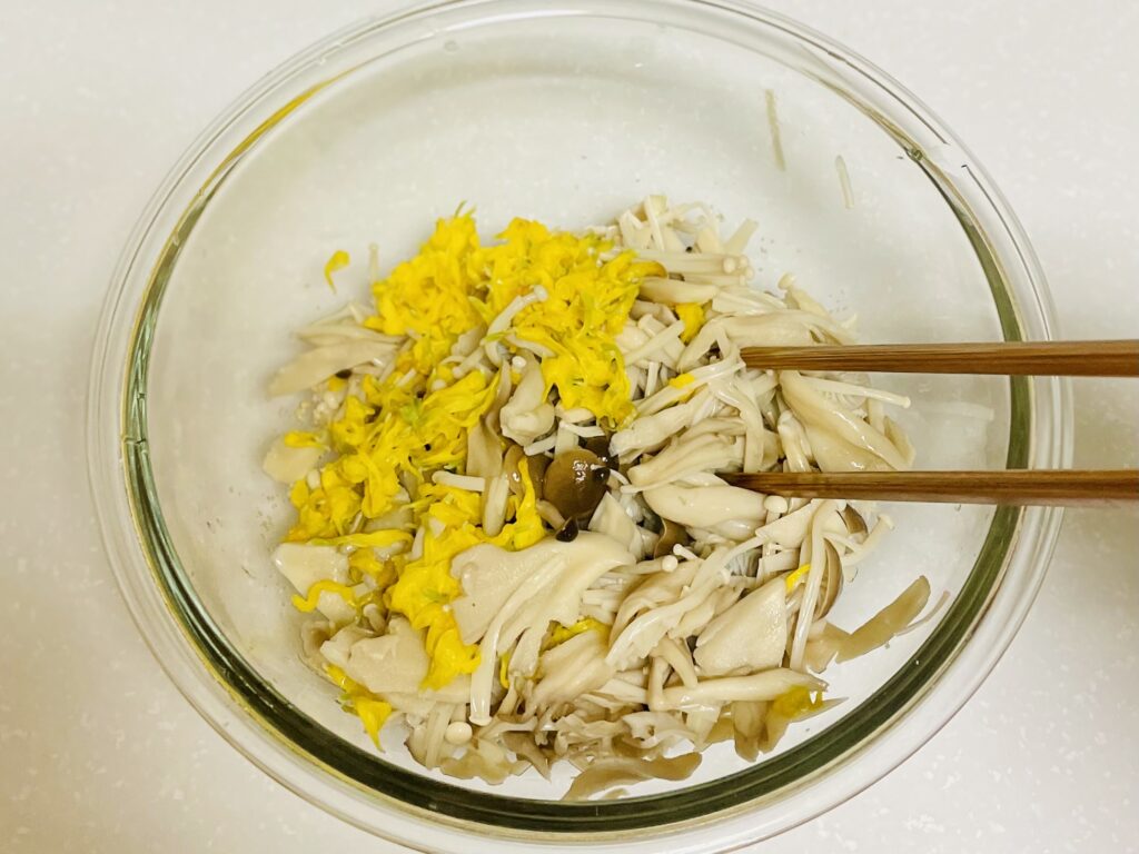 冷ましたきのこと菊花を③の和え衣でさっと和える。味見をして塩で味を整える。