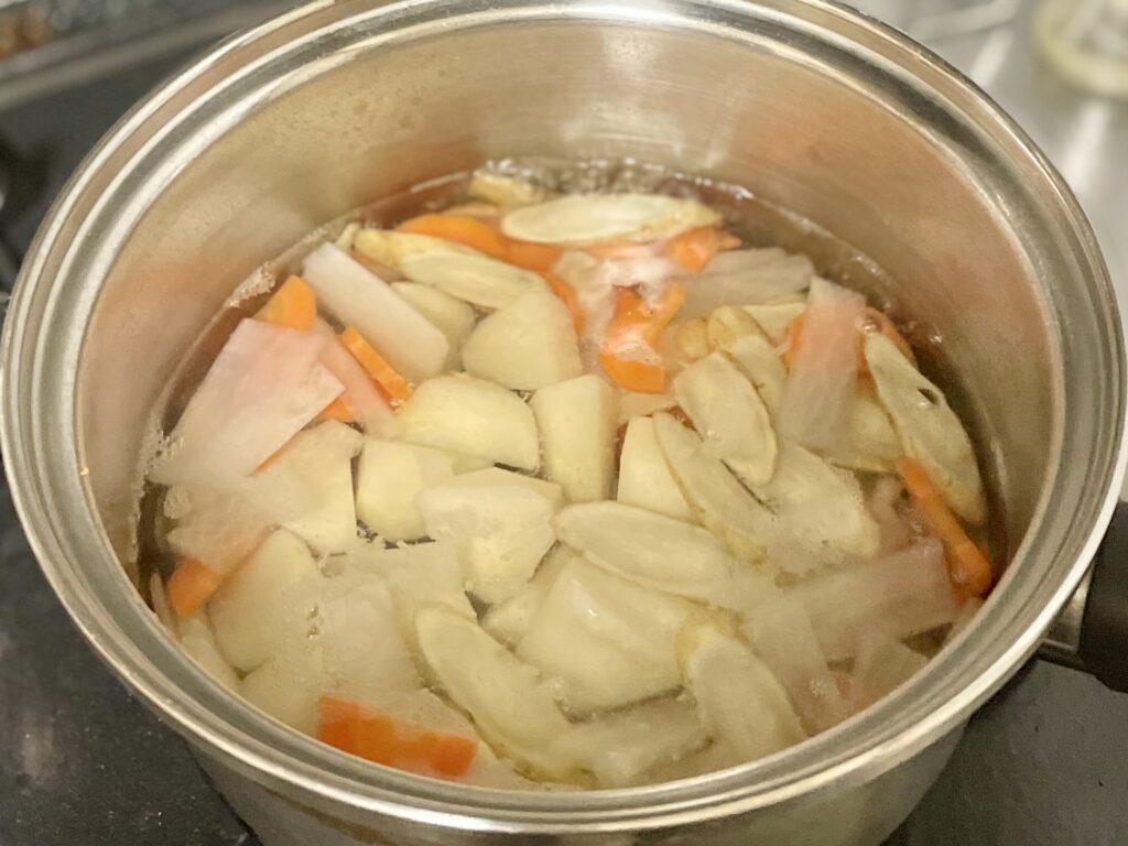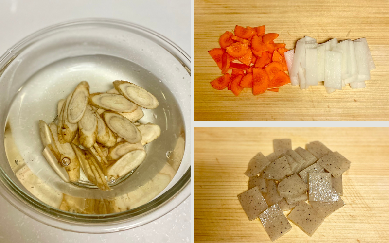 大根は厚さ3mmほどの短冊切り、にんじんは半月切りまたはいちょう切りに。ごぼうはたわしでよく洗い、斜め薄切りにして酢少々を入れた水に浸してアクを抜く。