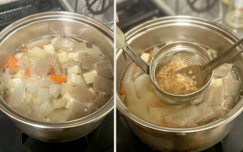 豆腐を加えて温め、いったん火を止めて味噌を溶き入れる。