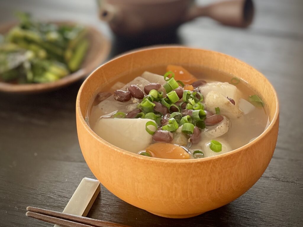 大根や里芋、豆類など、家にある野菜をたっぷり使った具だくさんの汁物です。