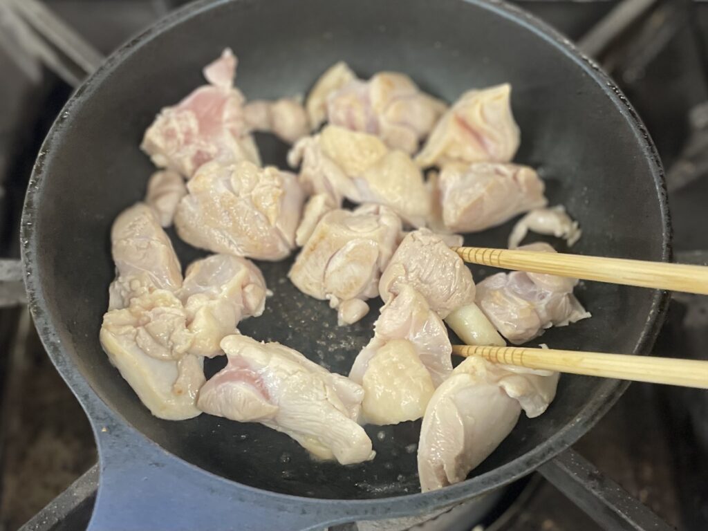 鍋に油を熱し、鶏肉を入れて表面に軽く焼き色がつくまで炒める。