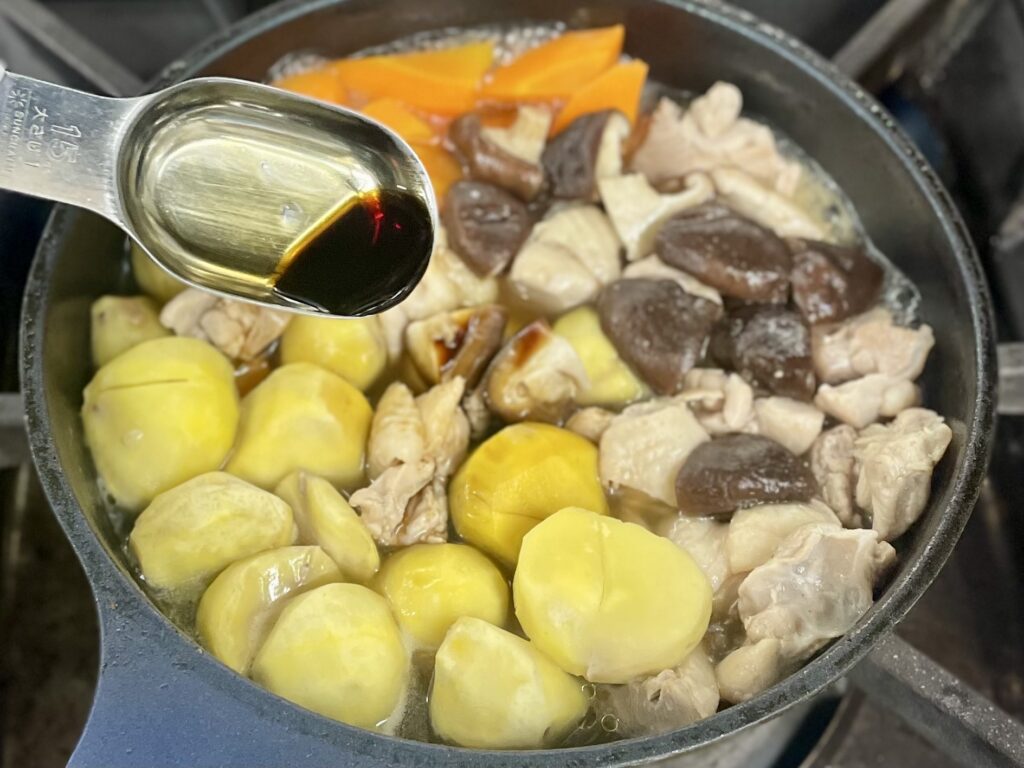 余熱でじんわりと味がしみ込み、栗や人参にだしのうま味がしっかりと染み込みます。