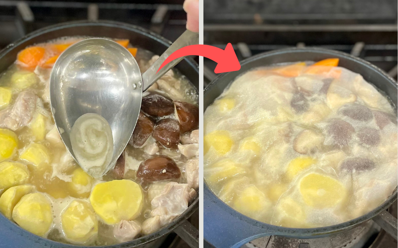 だし汁とみりんを加え、ひと煮立ちしたらアクを取り、栗、人参、椎茸を入れる。落とし蓋をして弱火で約10分煮る。