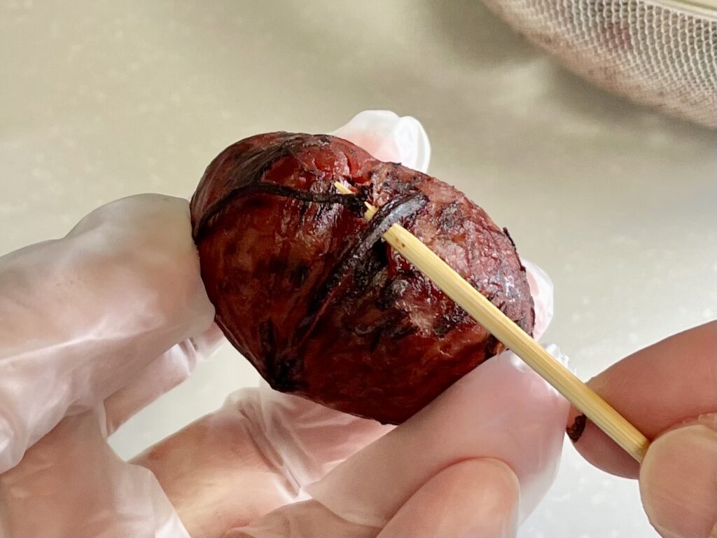下ゆでで柔らかくなった渋皮を竹串や指先でやさしくこそげ、筋や毛羽立ちを取る。