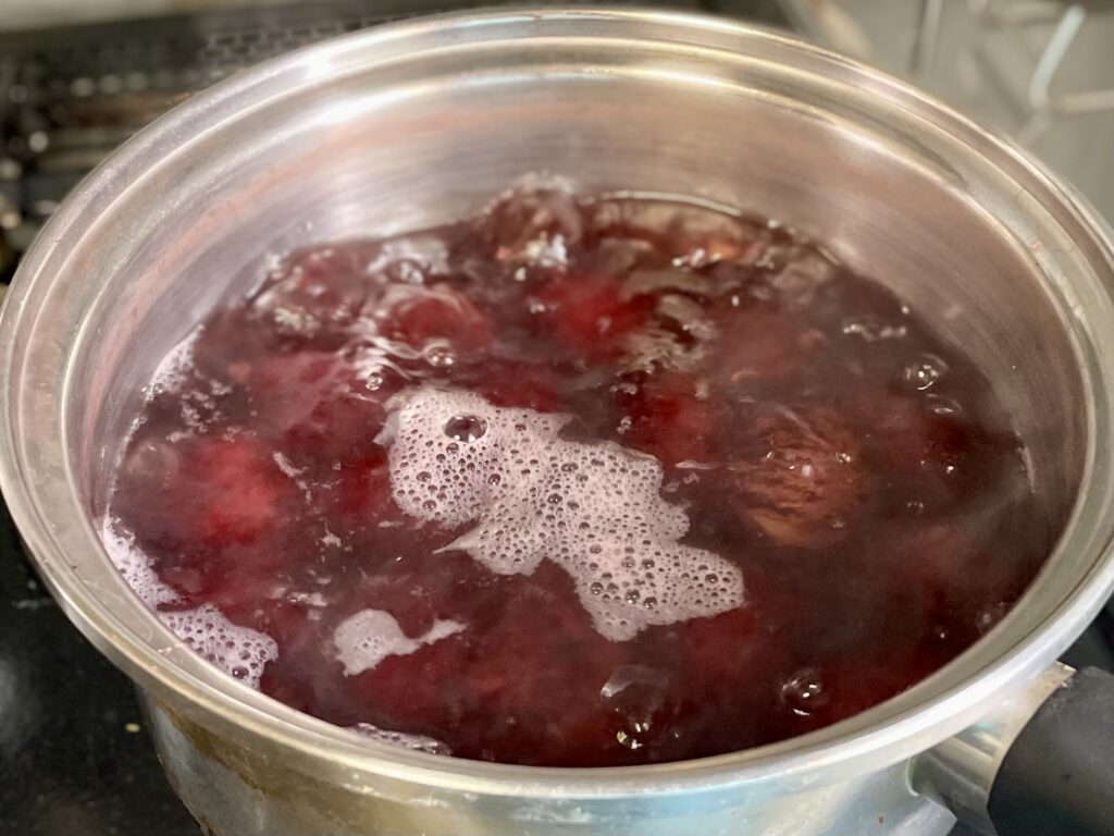 - 砂糖を3回に分けて加え、弱火で煮る。