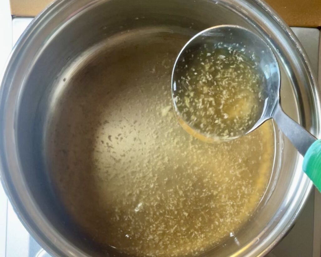 鍋にだし汁・薄口しょうゆ・みりんを入れて火にかけ、ひと煮立ちしたら水溶き片栗粉を加え、なめらかなとろみをつける。火を止めておろし生姜を加える。