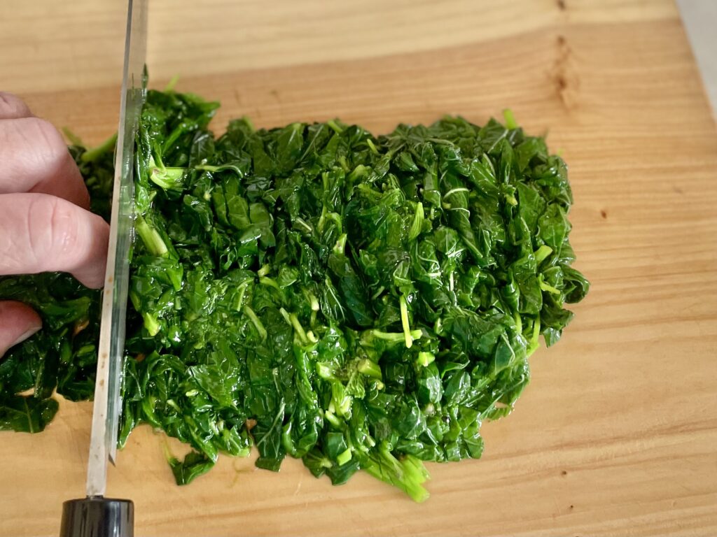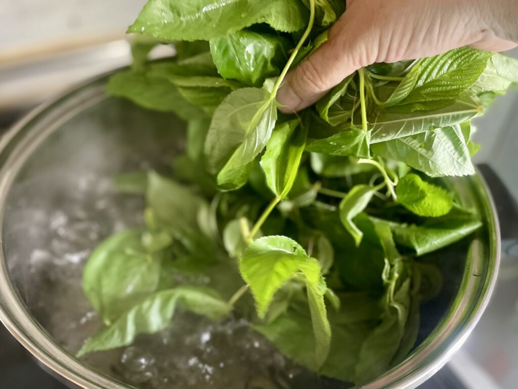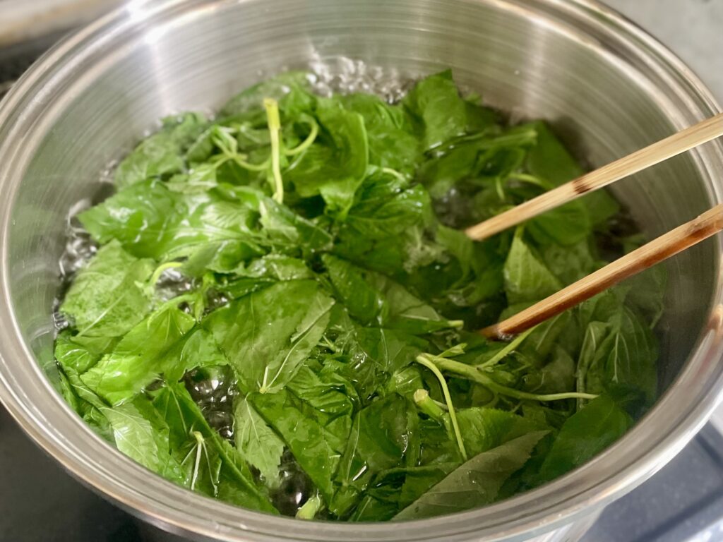 モロヘイヤは葉を摘み、柔らかい茎を少し残して熱湯で30〜40秒ほどさっと茹でる。冷水にとって色止めをし、水気をしっかり絞って食べやすく刻む。