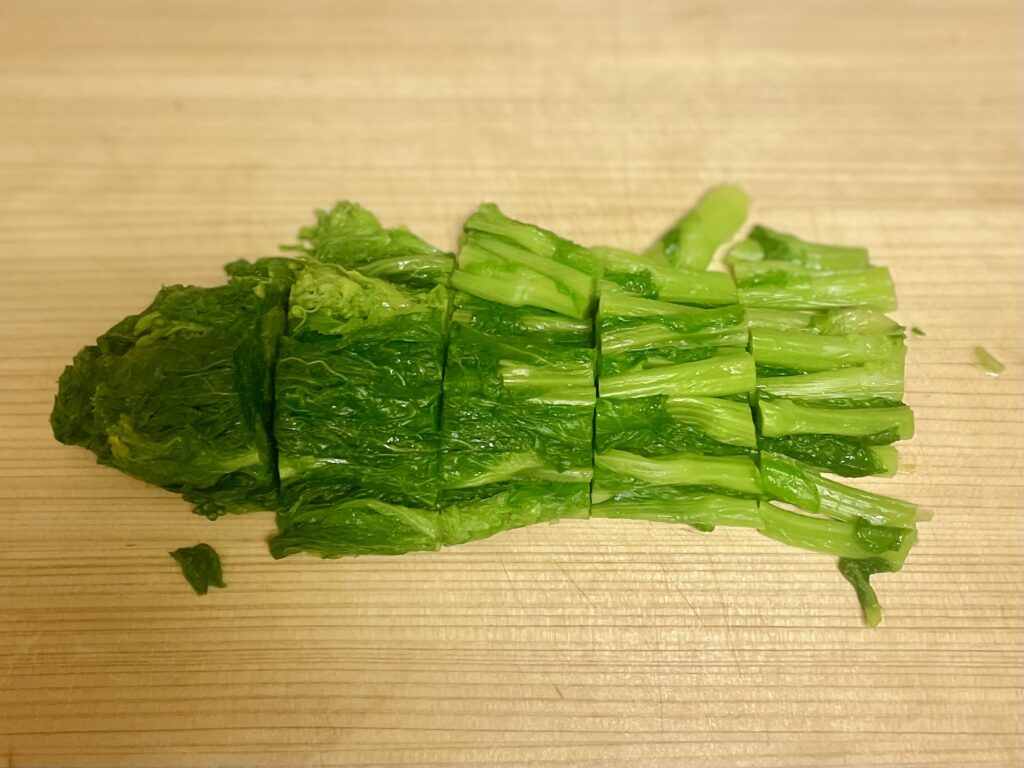 3〜4cmほどの長さに切る。(切ったあと、もう一度軽く水気を絞ると、味がよりなじみやすくなる)
