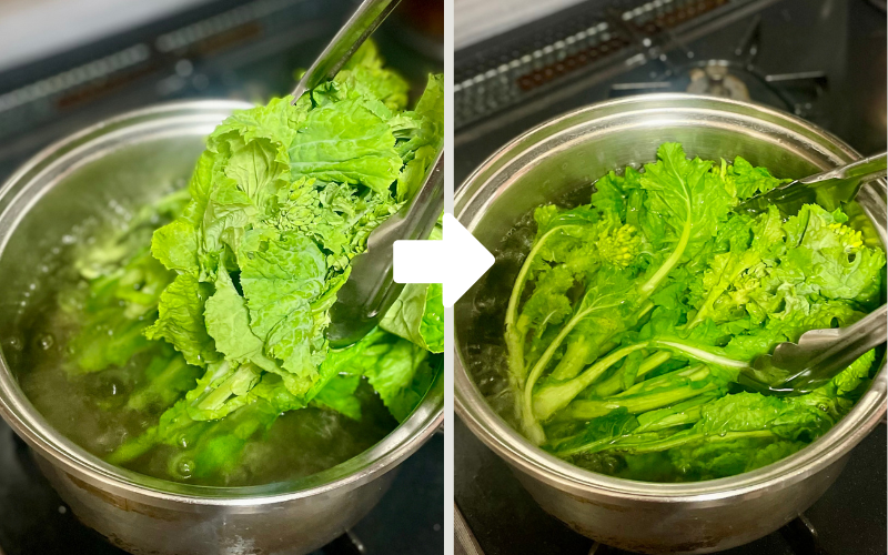 菜の花は茎から先に入れ、約30秒。全体を沈めてさらに30秒〜1分ほどゆでる。
