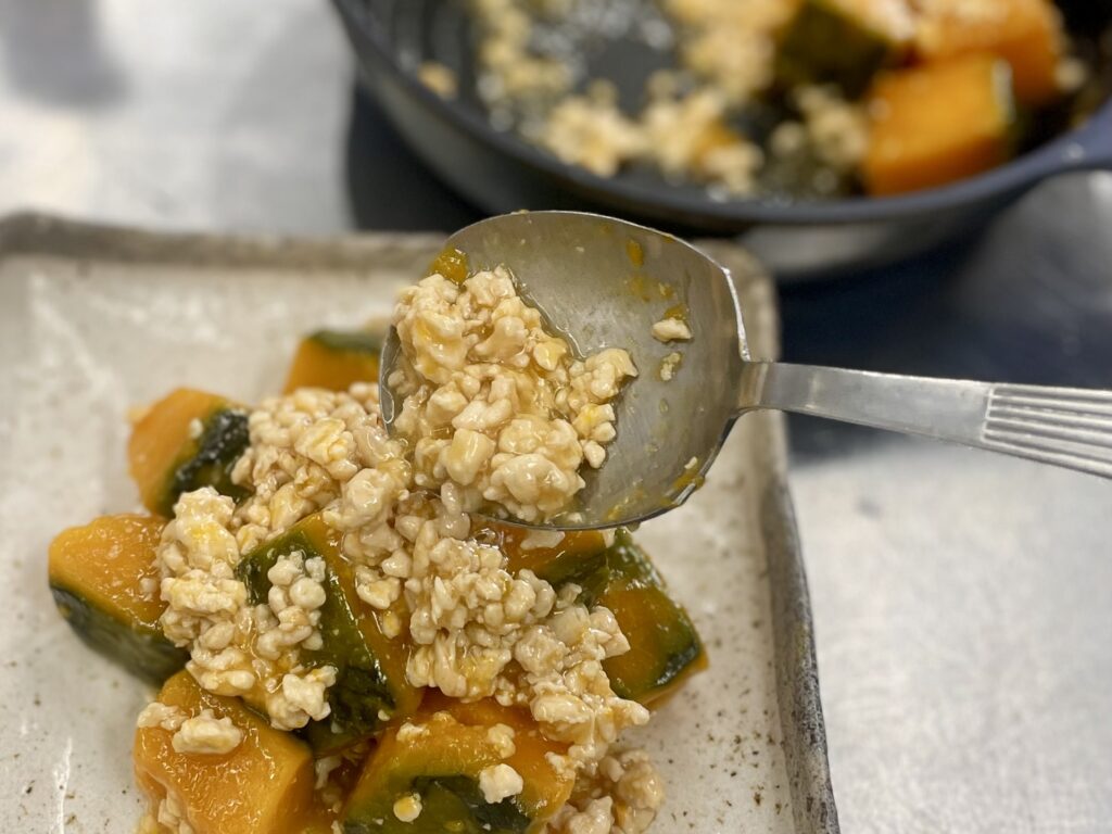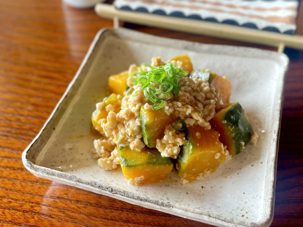 かぼちゃのほくほくとした甘みに、白味噌のやさしいコクと鶏そぼろの旨みを合わせた一品は、秋の食卓にぴったりです。
