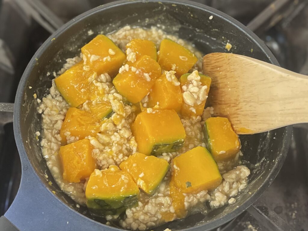 下ゆでしたかぼちゃを加え、静かに絡め合わせる。