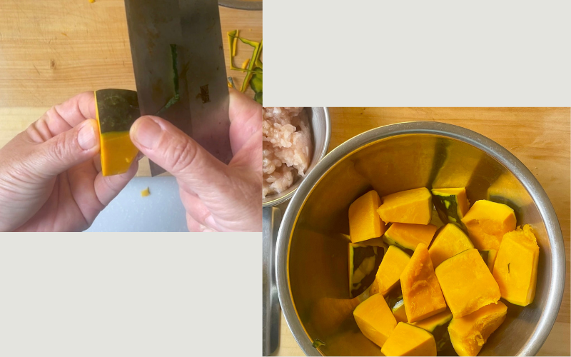 かぼちゃは種とわたを除き、皮つきのまま一口大に切る。角を軽く面取りし、鍋で3〜4分下ゆでして、竹串が通るくらいにやわらかくしておく。(茹ですぎ注意)