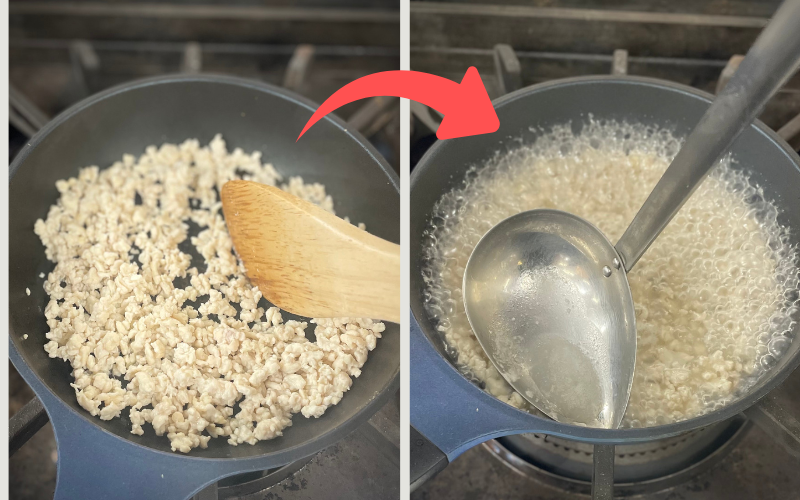 小鍋に鶏ひき肉を入れ、木べらでほぐしながら中火で炒める。色が変わったら水150mlを加え、アクを取りのぞく。