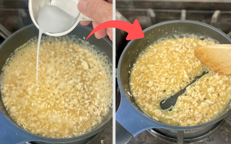 火をとろ火にして、水溶き片栗粉(片栗粉小さじ1+水大さじ1)を加え、混ぜながらとろみをつける。