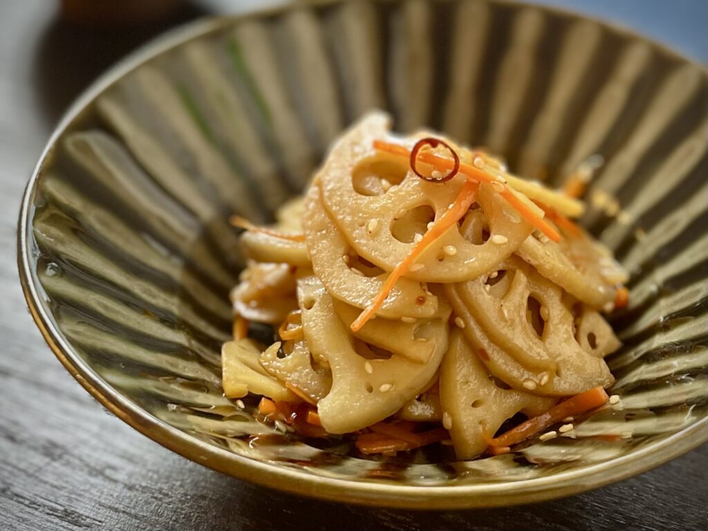 れんこんとにんじんの甘辛炒めは、特別な材料がなくてもすぐ作れる気軽さが魅力。