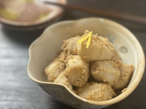 ほくほくとした食感と、照りのある見た目。シンプルながら、里芋本来の甘みやだしのうま味を味わえる一品です。