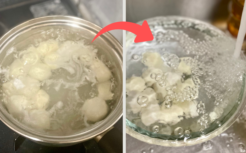 - 鍋に湯を沸かし、酢少々(小さじ1)を加えて3分ほど下ゆで。