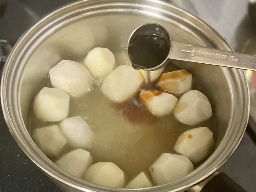 5分ほど煮たらしょうゆ大さじ2を加え、落とし蓋をして弱火で10〜12分煮含める。(満遍なくに煮絡めるように、途中で鍋をゆすって里芋を動かす)