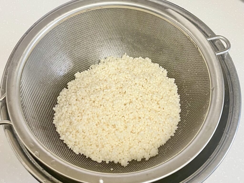もち米を洗い、ザルに上げて水を切り、15分置く。