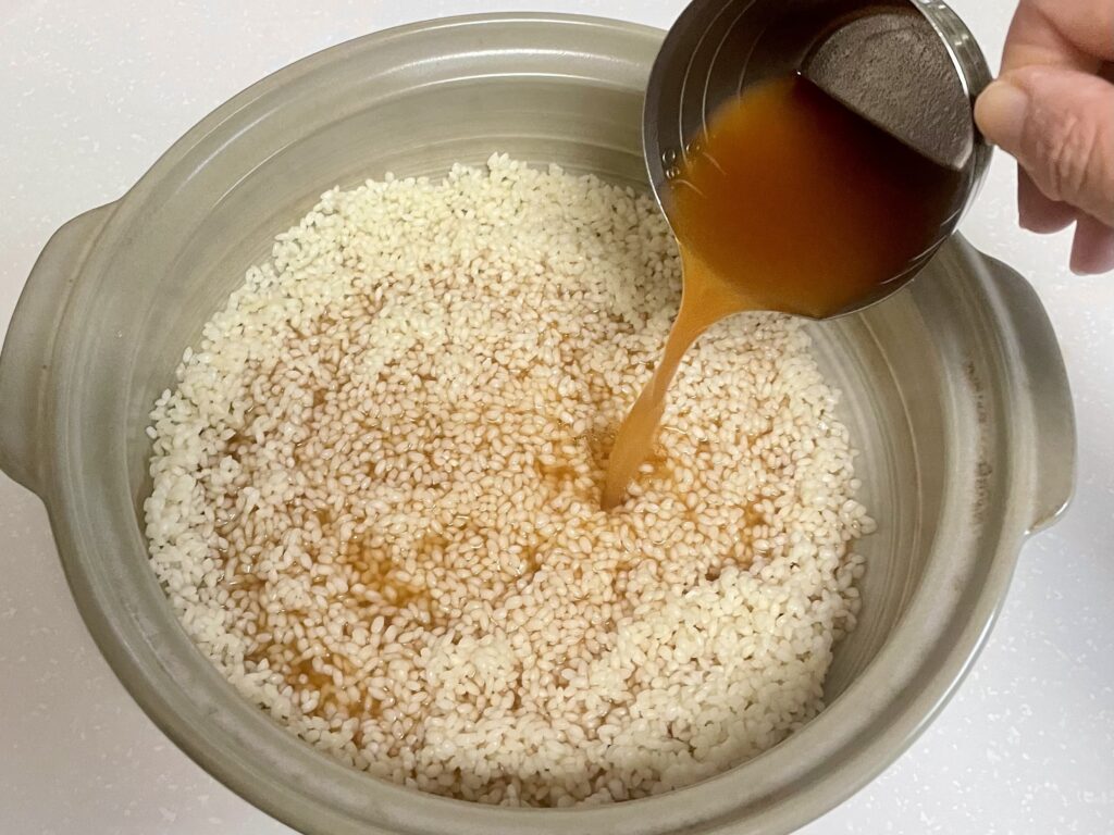 土鍋に、十分に水を切ったもち米と、煮汁+水(合わせて360ml)を入れ、30分ほど浸す。