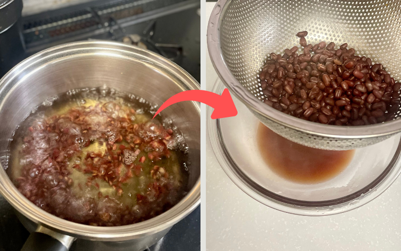 - ザルにあげて小豆と煮汁を分け、煮汁は取っておく。