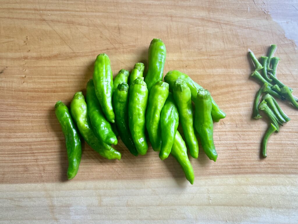 ししとうは額の先が長い場合は切り落とし、念のため破裂防止に包丁で1カ所、切れ目を入れておく。