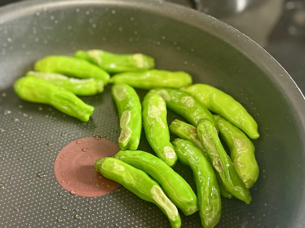 フライパンにごま油を熱し、ししとうを入れて中火で炒める。全体に軽く焦げ目をつけ、香ばしさを出す。