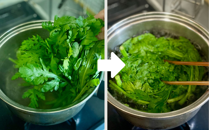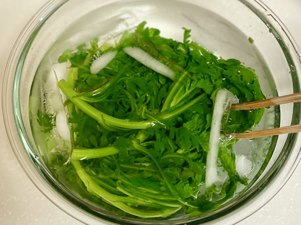 春菊の香りは熱で飛びやすく、柔らかいので茹ですぎないのがポイント。