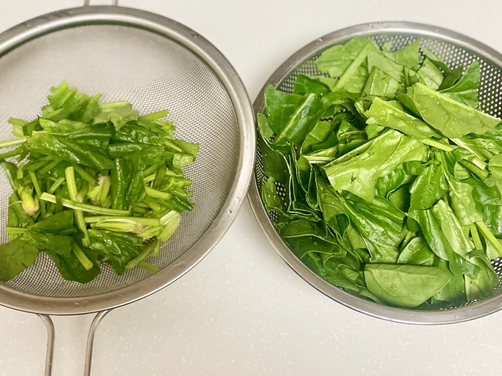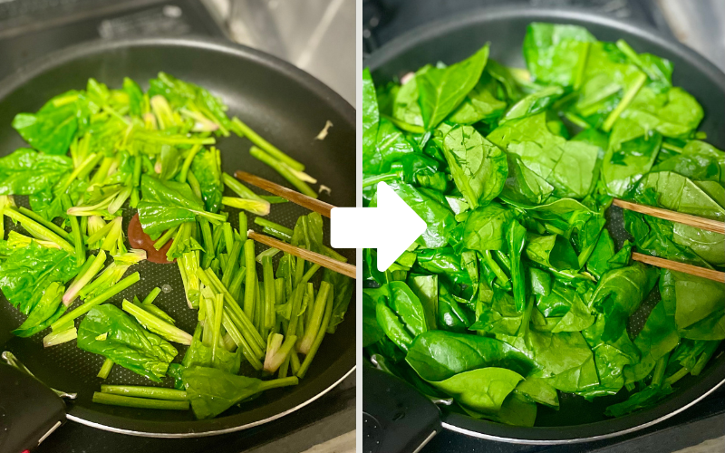 同じフライパンに、まずはほうれん草の茎部分を入れ、30秒程炒めたら葉を加えて強火で一気に炒める。