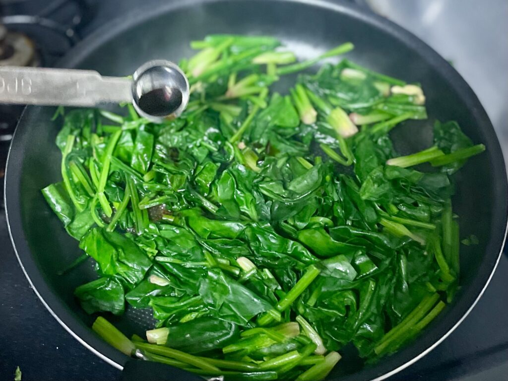 ほうれん草がしんなりしたら、弱火にしてしょうゆを回しかけて全体にからませる。